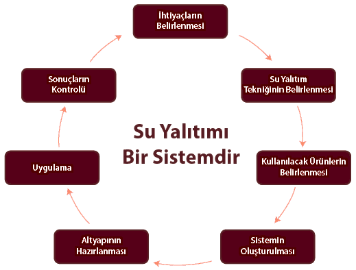 Su Yalıtımı Bir Sistemdir : Su yalıtım malzemelerinin görevi, yapı dışındaki su ve nemin yapı içerisine girişini engellemektir. Su yalıtımının etkinliğini sadece yalıtım malzemesinin özellikleri belirlememektedir. Amaca uygun ürününün tercihi (temel-perde, ıslak hacim, teras vs.), doğru sistem detayının tayini, uygulama yüzeyinin düzgün hazırlanması ve diğer sistem bileşenlerinin (koruma, drenaj, vs.) uyumu ile su yalıtımı bir sistemdir. Yalıtımın etkinliği ancak sistemin düzgün çalışması ile mümkündür.